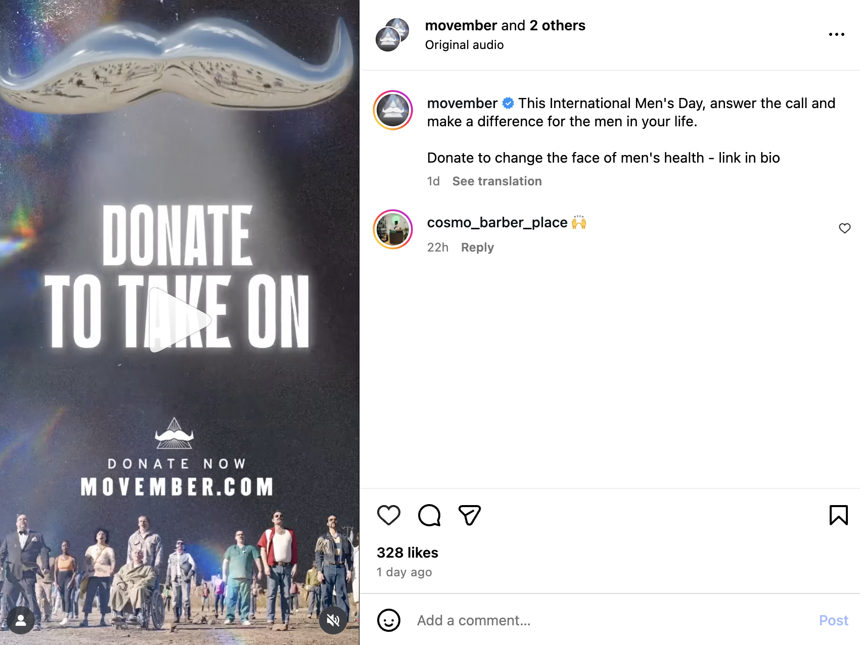 Movember used Instagram, TikTok, and X (Twitter) to share progress photos, creator partnerships, and health facts.