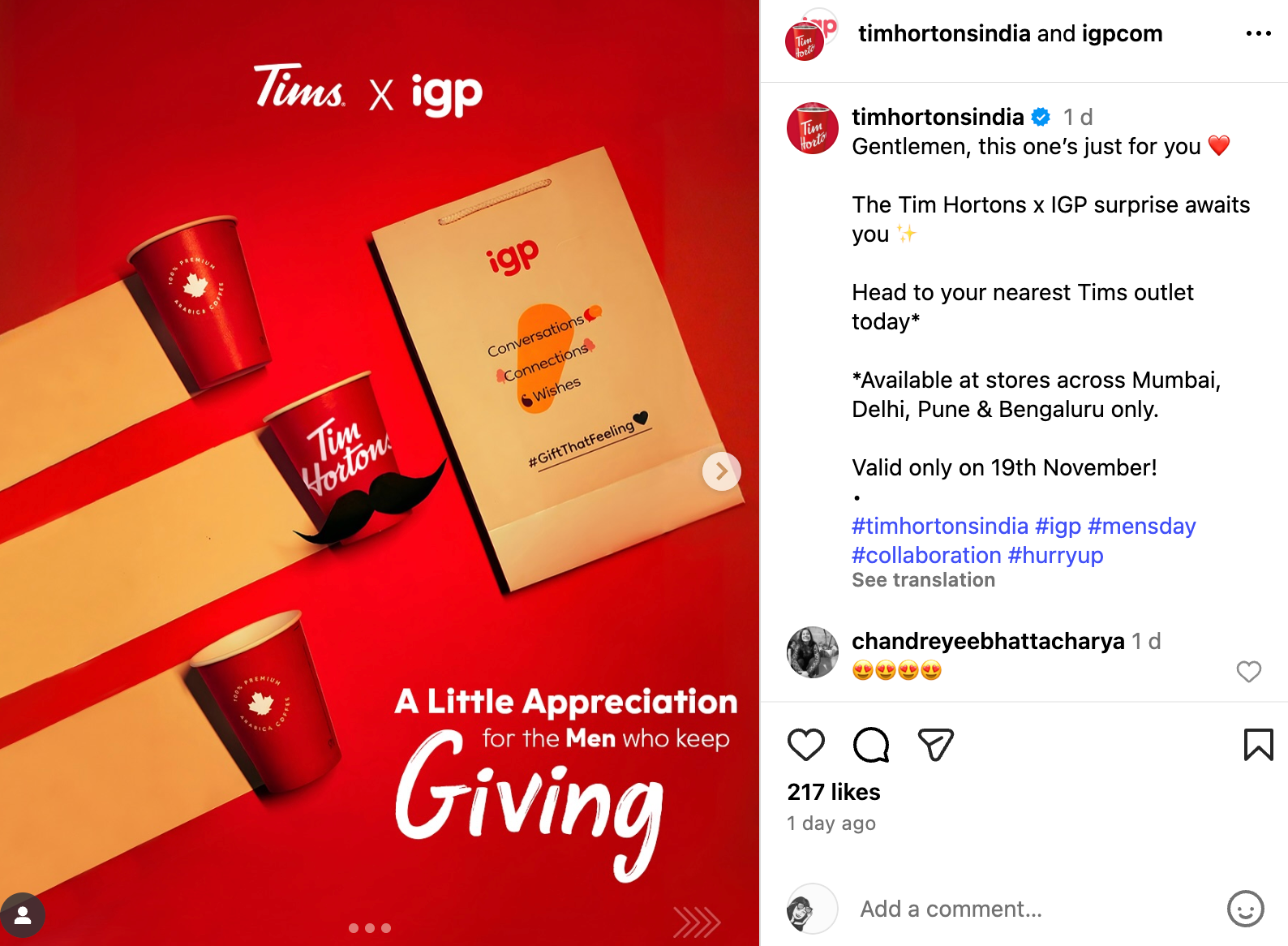 IGP, a global D2C gifting platform, partnered with Tim Hortons India for a thoughtful International Men's Day initiative on November 19th.