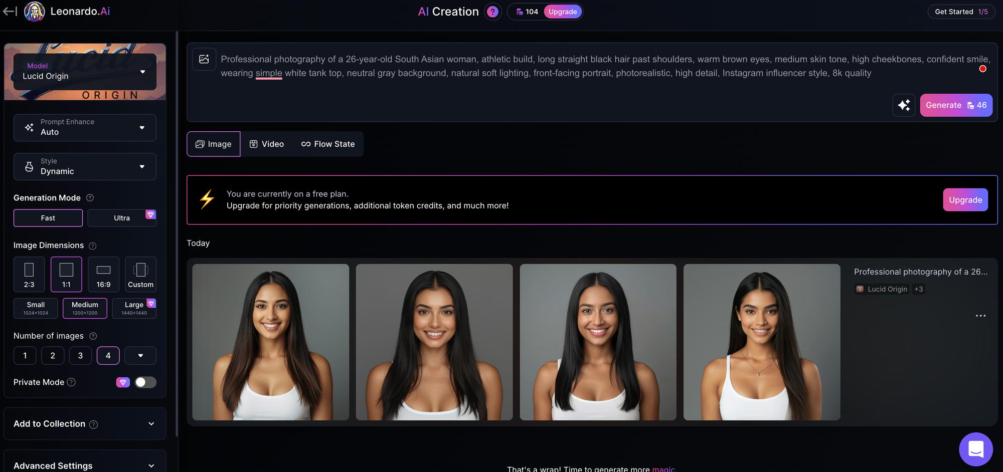For example: "Professional photography of a 26-year-old South Asian woman, athletic build, long straight black hair past shoulders, warm brown eyes, medium skin tone, high cheekbones, confident smile, wearing simple white tank top, neutral gray background, natural soft lighting, front-facing portrait, photorealistic, high detail, Instagram influencer style, 8k quality" - Set up character reference (Leonardo only, 5 minutes): Upload your base image to Leonardo.AI. Save as character reference. This locks in the face for all future generations.